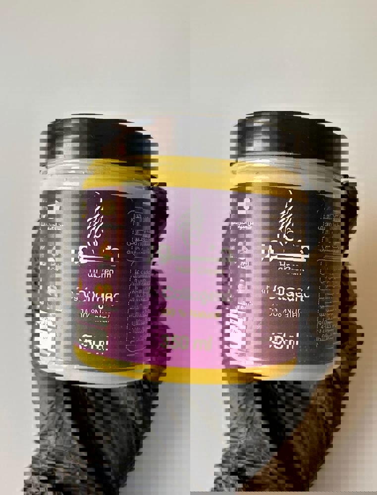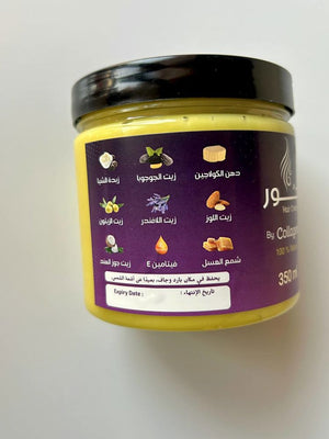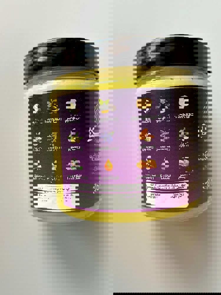 دهن الكولاجين - زبدة الشيا - زيت الجوجوبا -زيت اللوز - زيت اللافندر - زيت الزيتون - فيتامين E - شمع العسل - زيت جوز الهند